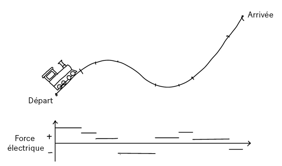 Les forces et les critères se combinent pour former un ensemble d'équations qui doivent être résolues ensemble afin de déterminer la force électrique optimale pour le trajet. Dans les cas simples, il est possible de trouver une force électrique continue qui satisfait aux forces et aux critères ; la force électrique requise pour un trajet ferroviaire bidimensionnel idéal en montée pourrait ressembler à ceci :